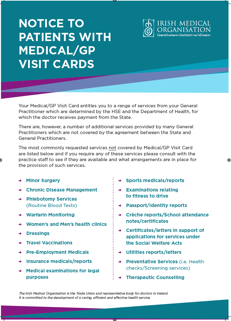 Your Medical Card or GP Visit Card entitles you to a range of services from your General Practitioner. These services are determined by the HSE and the Department of Health, and your doctor is reimbursed by the State for providing them.